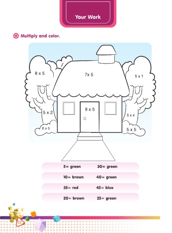Your Work Multiply and color. 8 x 5 7x 5 5 x 1 9 x 5 5 x 2 5 x 4 6 x 5 5 x 5 5= green 30= green 10= brown 40= green 35= red 45= blue 20= brown 25= green 32